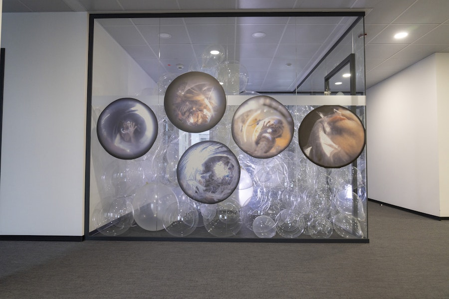 Aufblasbare Plastikbälle, C-Prints, Sound-Installation
